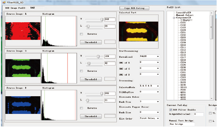 專利的RGB Tune功能通過(guò)單獨(dú)拍攝紅綠藍(lán)三原色照片并結(jié)合獨(dú)特的顏色過(guò)濾算法,完美的解決橋接誤判和相對(duì)基準(zhǔn)面不確定的問(wèn)題,并同時(shí)提供2D/3D測(cè)量 結(jié)果和彩色的錫膏圖片,配合2D光源有效避免錫膏因紅光角度問(wèn)題導(dǎo)致的RGB彩色效果失真;不同基板顏色的RGB調(diào)試通用性更強(qiáng)大幅度提升設(shè)備的(高度, 體積,面積)重復(fù)性精度。