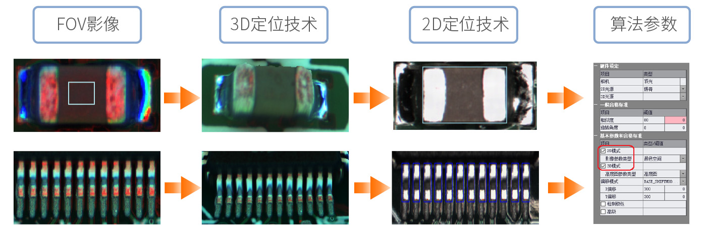 3DAOI采用3D本體定位技術,2D定位技術作為輔助,保證Chip 與IC等元器件的本體與PIN腳定位準確及黑色等特殊元器件的本體定位準確。